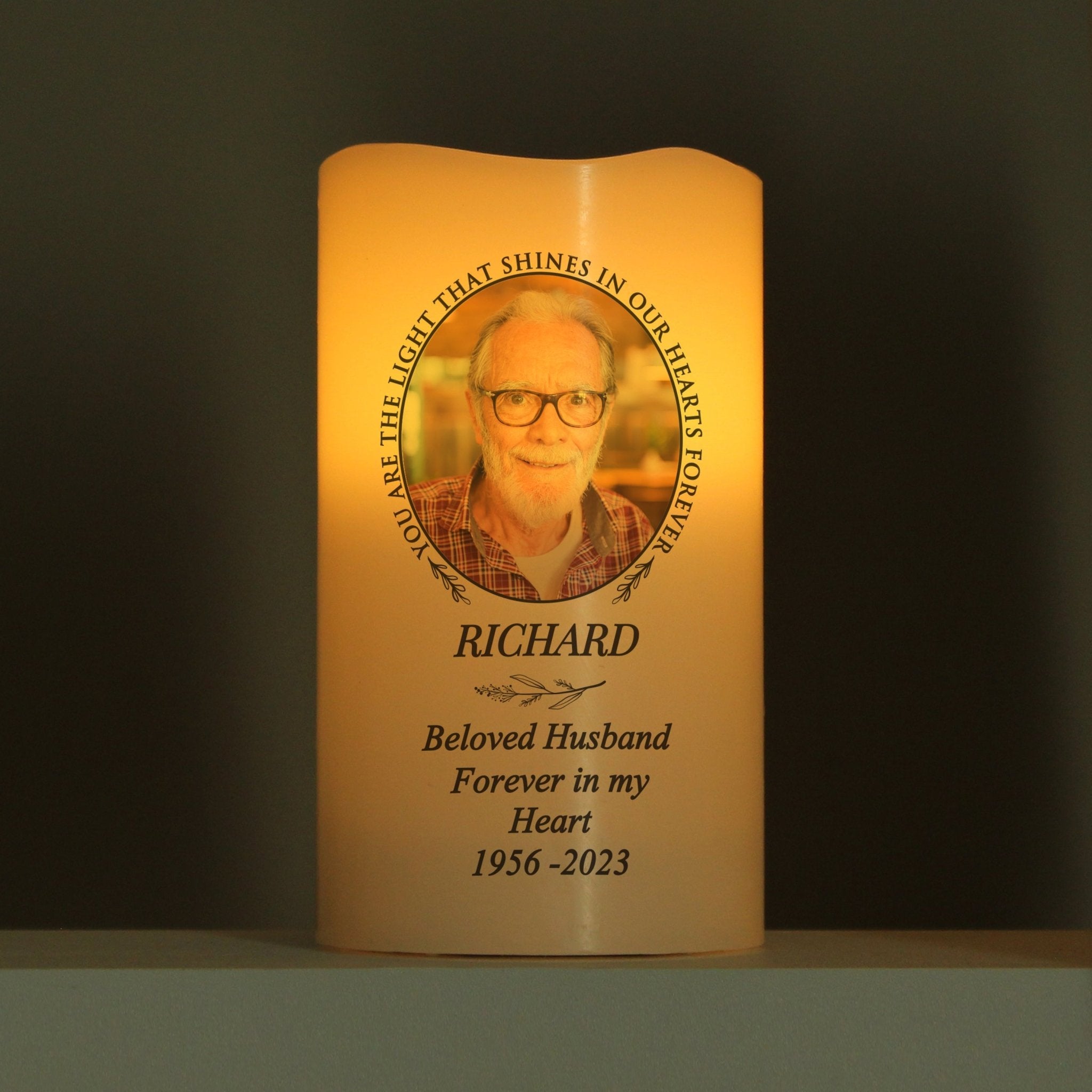 This beautiful Personalised Light In Our Hearts Photo Upload LED Candle is the perfect way to add light and love to your home and honor your memories. With a sweet, sentimental message and the ability to upload a special photo, this LED candle will keep your memories, and the light in your hearts, burning strong forever.