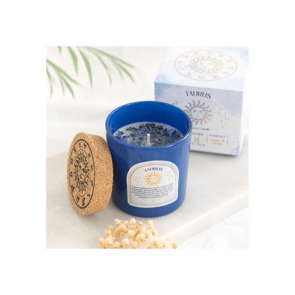 Bring power and positivity to individuals born between April 20 and May 20 with this stunning Taurus zodiac candle. An Amber & Vanilla fragrance is accented by a sprinkling of lapis lazuli chips that can later be reused for a multitude of spiritual purposes. Lapis lazuli encourages the earthy Taurus to expand their perception and connect to their spiritual side. This enlightening gemstone helps Taureans to be more expressive and communicative and boosts their self-confidence and self-awareness. Packaged in a matching sliding box that's perfect for gifting and display. Paraffin wax. Crystals will release from wax with use. Approximate burn time of 21 hours. Please practice caution when burning and never leave lit candle unattended.