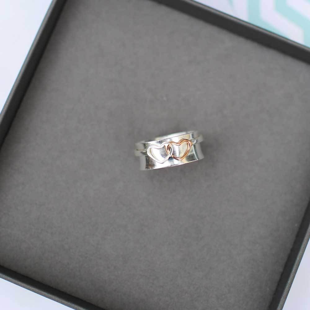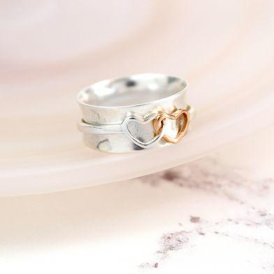 This beautiful Twin Hearts Spinning Ring is handcrafted to the highest standards and is meticulously beaten to show the finest details. Made from 925 Sterling Silver, it's presented in a gift box and includes a gift note printed on thick luxe card. It features 2 moving hearts.